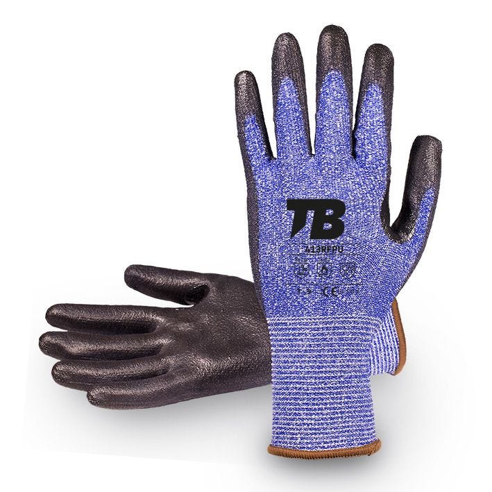 Composição: Luva de suporte sem costuras em HDPC, fibra de vidro e nylon azul. Revestimento da palma em poliuretano preto. Reforço em nitrilo preto entre o polegar e o indicador. Punho elástico. Calibre 13.