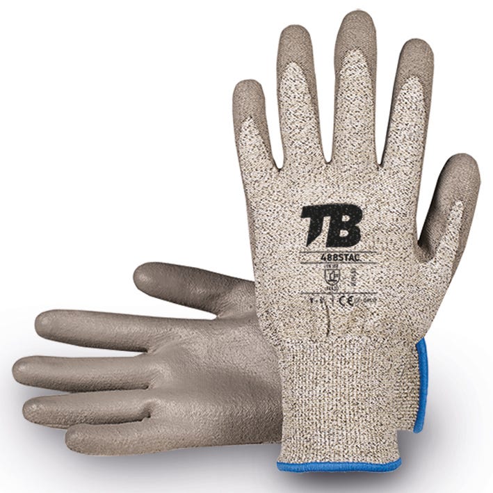 Composição: Suporte em HPPE, fibra de vidro, fibras de carbono, náilon e elastano sem costura. Revestimento de poliuretano cinza na palma da mão. Punho elástico. Calibre 13. Resistividade vertical = 10^6 Ohm.