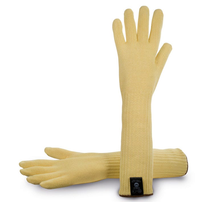 Tecido de para-aramida com alta resistência à abrasão e à tração. Ambidestra. O design sem costuras evita irritações e assaduras causadas por costuras. Excelente proteção contra cortes. Forro de algodão para maior resistência ao calor. Punho de 25 cm oferece proteção extra para o braço.
