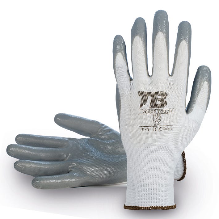 Composição: Luva de suporte em poliéster branco sem costuras. Revestimento de nitrilo cinza na palma da mão. Punho elástico. Calibre 13.