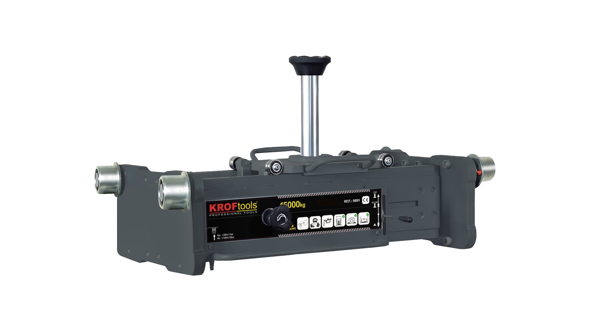 Características: Capacidade de elevação: 15T Curso: 200mm Altura mínima: 420mm Altura máxima: 620mm Largura (sem rodas): 840-1140mm Largura (com rodas): 920-1220mm Profundidade: 665mm Alimentação de ar: 0.75-1.2Mpa