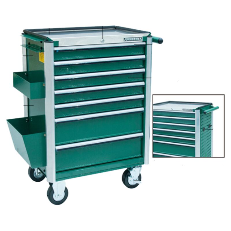 Carro vazio para ferramentas com 7 gavetas Características: 1 Painel lateral perfurado 1 Painel lateral para compartimentos de arrumos 4 Rodas, 2 direccionais com travão Capacidade de carga: 160kg/roda Tampo em aço * As caixas laterais são opção Ref.: C-7DS1