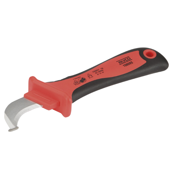 Faca para descarnar mangueiras de cabos, com isolamento, para trabalhos de eletricista. Dupla aresta de corte, de 40 mm, sendo uma reta e outra curva. Recomendada para trabalhar com mangueiras de cabos de forma simples e eficaz. Garra para realizar cortes longitudinais sem danificador o cabo.