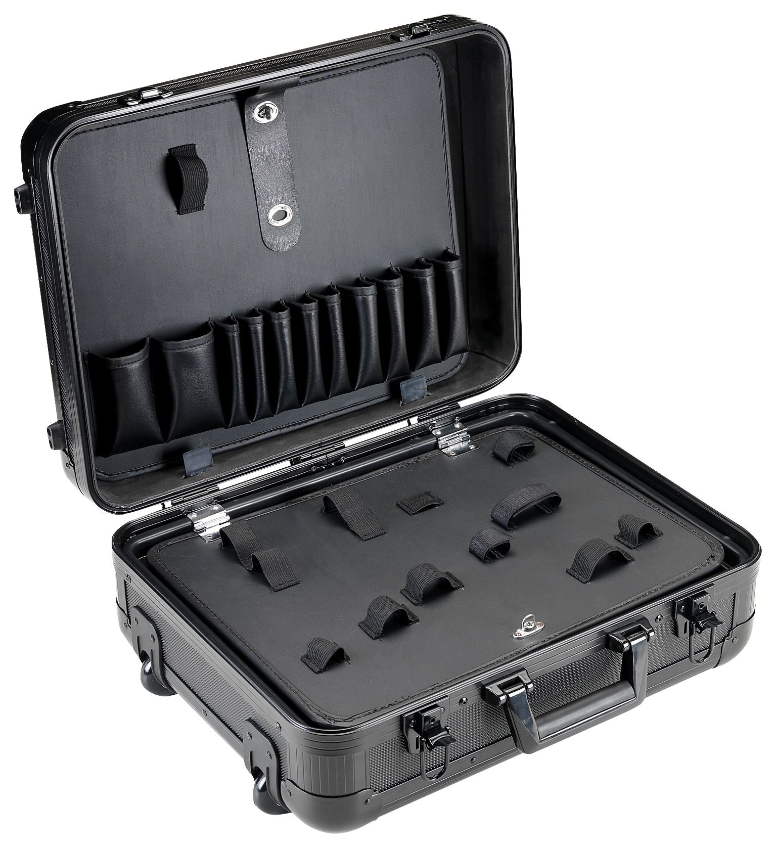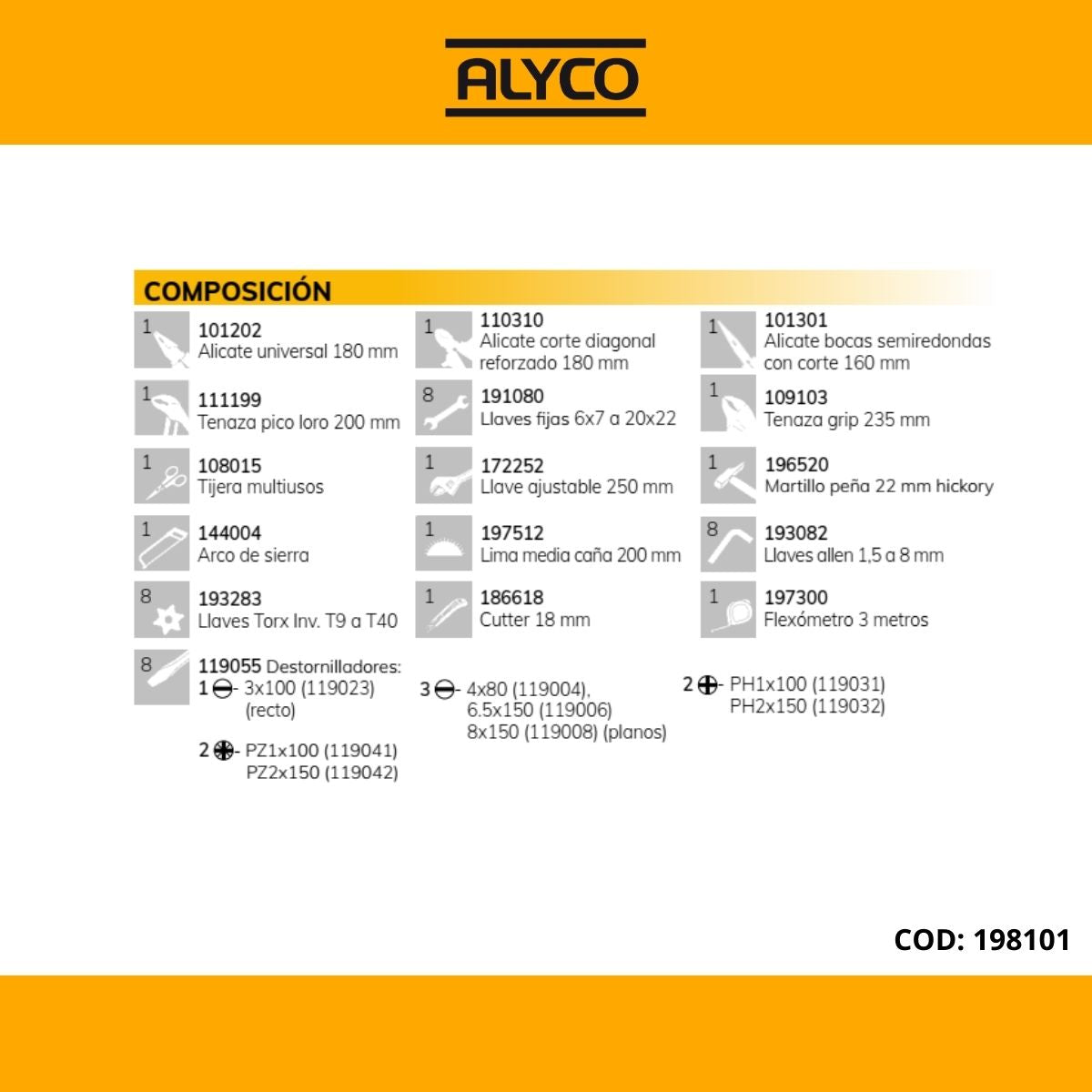 Eleve a sua produtividade com o MALA ALUMINIO REFORÇADA 51 PEÇAS . Concebido para profissionais que exigem precisão, durabilidade e conforto de utilização. Maleta reforçada leve e compacta para transporte e armazenamento de ferramentas. Grande capacidade. Organização pelo painel interior, permitindo guardar muitas ferramentas e separar em duas maletas e pelos separadores da base. Cómoda porque se pode levar pela pega extensível com as rodas, pelo cabo e pela alça. O duplo sistema de fechadura com chave oferece grande segurança. Muito rígida por causa dos painéis em alumínio e pelos reforços antichoque. Fornecimento amplo de ferramentas. Muito útil para trabalhos no exterior como, por exemplo, manutenção, montadores, pessoal externo, etc., na indústria, construção, reparação de veículos, etc. Fornecimento das seguintes ferramentas: Jogo de 8 chaves fixas de boca dupla em aço cromo-vanádio, medidas: 6x7 a 20x22 mm. 1 navalha de 8 chaves Allen de 1,5 a 8 mm. 1 navalha de 8 chaves Torx inviolável de T9 a T40. 1 arco de serra com lâmina bimaterial de 300 mm. 1 flexómetro de 3 m x 16 mm Classe II. 1 chave inglesa ajustável de 10? (250 mm). 1 alicate universal de 180 mm, 1 alicate de corte reforçado de 180 mm, 1 alicate de pontas com corte de 160 mm e 1 tenaz bico-de-papagaio de 200 mm. 1 alicate tenaz com corte de 235 mm. 1 tesoura de eletricista de 145 mm. 1 lima de meia volta de 200 mm. 9 chaves de fendas de ponta plana, reta, PH e PZ. 1 cortador de lâminas fragmentáveis de 18 mm. 1 martelo mecânico de 180 g. Muito útil para equipas de manutenção, armazenamento em veículo, montagem de equipamentos no exterior, trabalhos de bricolage, etc. SKU: 198101 | EAN: 8421504981015 Ficha técnica Compre agora na GWS e receba em Portugal com rapidez, confiança e suporte especializado.